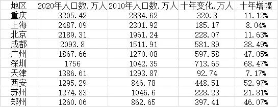 位居第7到第10的城市分别是天津、西安、苏州、郑州。其中,西安和郑州人口都实现快速增长,超越了九省通衢武汉,武汉人口总量退出前十。