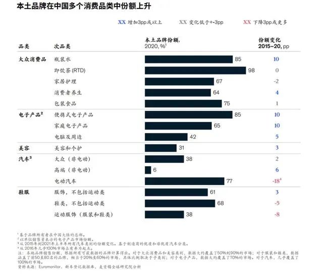 大多数家用消费品如瓶装水、茶叶、包装食品等中国本土品牌(指品牌所属企业总部位于中国内地)在过去十年里的大部分时间一直占据市场多数份额;在美容、汽车等领域,全球企业向来在中国占据最大的市场份额,但中国企业正在迎头赶上;国潮在服装、鞋类领域得到了广泛关注,但在不同子品类的表现又有所不同。