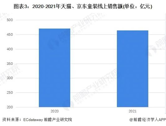 从线上渠道看,2021年京东和天猫两大电商平台母婴用品合计达到2042.2亿元,其中童装销售额为464.4亿元,较2020年下降1.3%,但是仍占母婴用品较大份额。