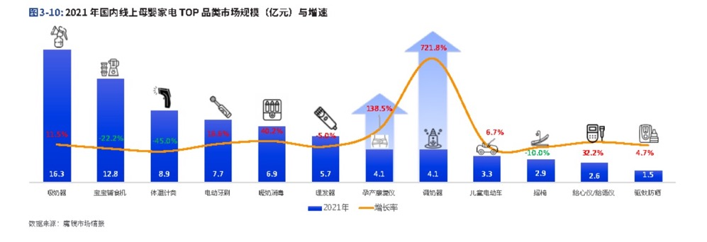 据《2022全球小家电趋势洞察白皮书》了解,在母婴小家电繁多品类中,2021年线上母婴小家电销售规模最大的是吸奶器,年零售额突破16亿元;其次是各种辅食料理机,年零售额突破十亿大关。调奶器、婴童电吹风和孕产康复仪增速远高于其他品类,2021年销售额同比分别为721.8%、140.7%、138.5%。