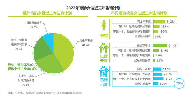 另一个细节,相比未婚以及已婚未孕人群,已婚已育的妈妈生育意愿更高,75%已育女性有“追生”意愿,尽管她们顾虑也更多。