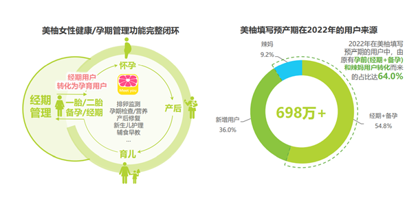 艾瑞还发现,超六成新生儿妈妈孕前即绑定母婴App。在美柚上,填写预产期在2022年的逾698万用户中,从原有孕前(经期+备孕)和辣妈转化而来的用户分别占比54.8%和9.2%,总计64.0%。